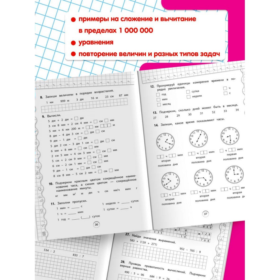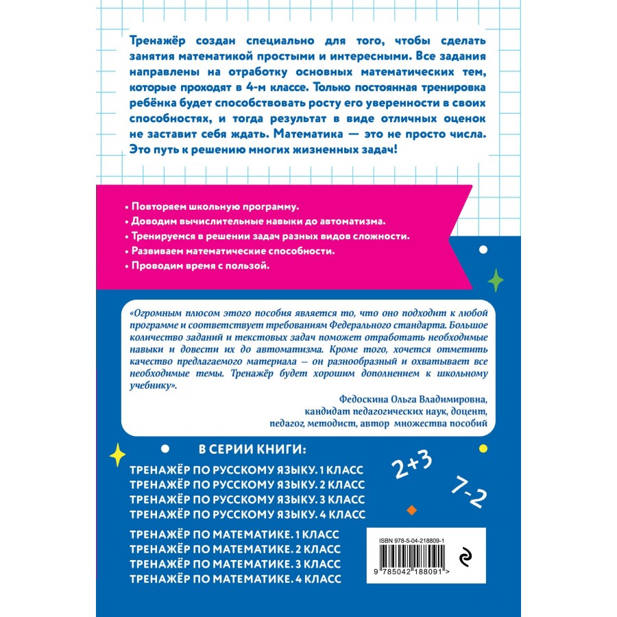 Пособие от издательства «Эксмо», соответствующее ФГОС, разработано специалистом с многолетним опытом работы и станет отличным помощником для учеников 4 класса в отработке умений и навыков, полученных на уроках математики. Выполнение большого количества арифметических действий в пределах 1 000 000, решение уравнений и разных типов задач, величины и действия с ними дадут возможность школьникам в дальнейшем избежать вычислительных ошибок и довести навыки счёта до автоматизма. Занимаясь по книге, учащиеся научатся анализировать информацию и понимать учебную задачу, а также смогут закрепить пройденный материал, восполнить пробелы в знаниях, развить математические способности, повысить успеваемость по предмету. Задания в тренажере построены таким образом, чтобы не повторять, а дополнять упражнения, которые предлагаются в школе. Благодаря этому его можно использовать в сочетании с любыми из существующих учебников по математике. Кроме того, в серию входят и пособия по русскому языку для 1, 2, 3 и 4 класса. Только постоянная практика позволит школьнику уверенно чувствовать себя на уроках и получать отличные оценки.