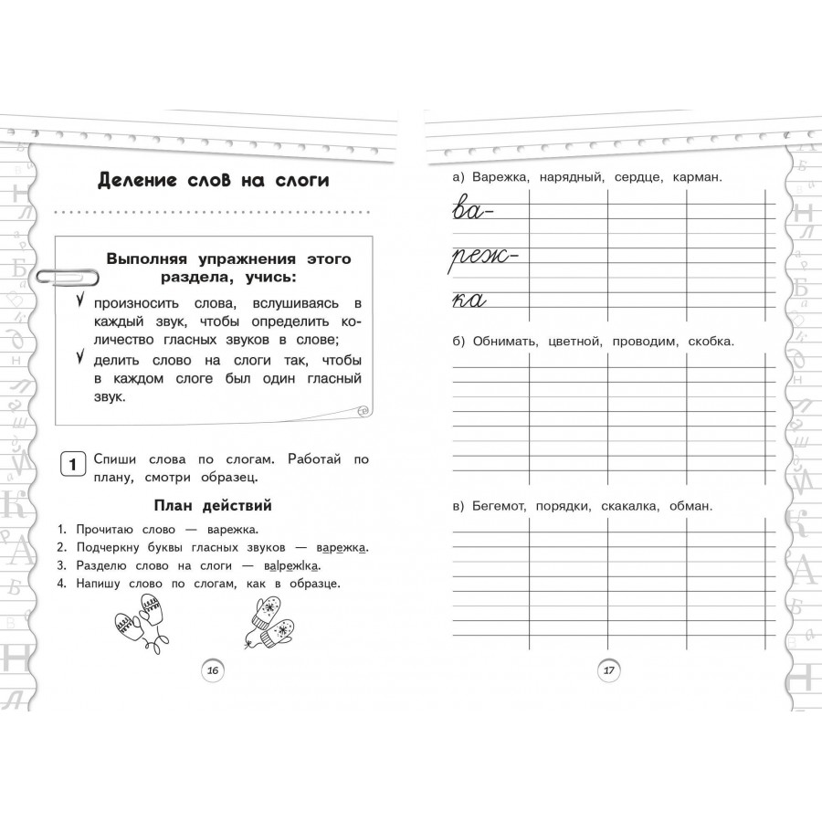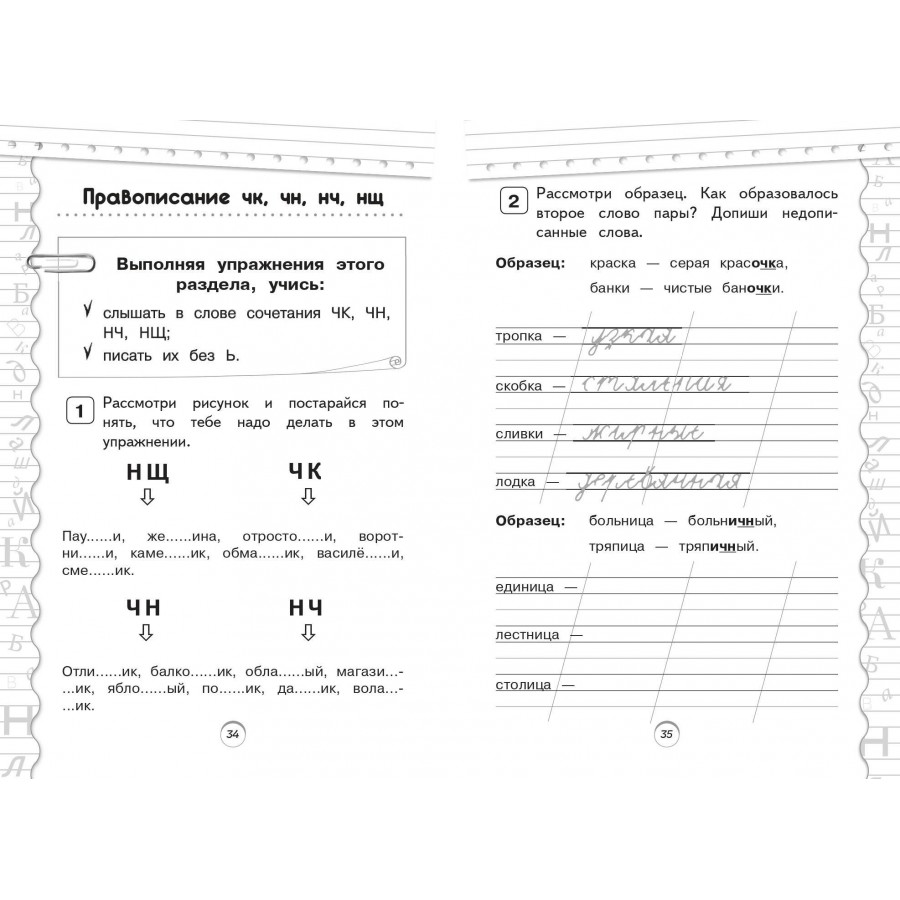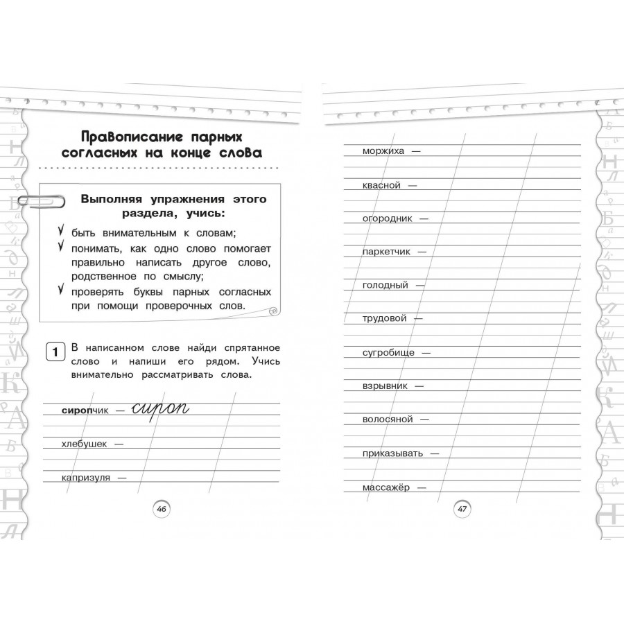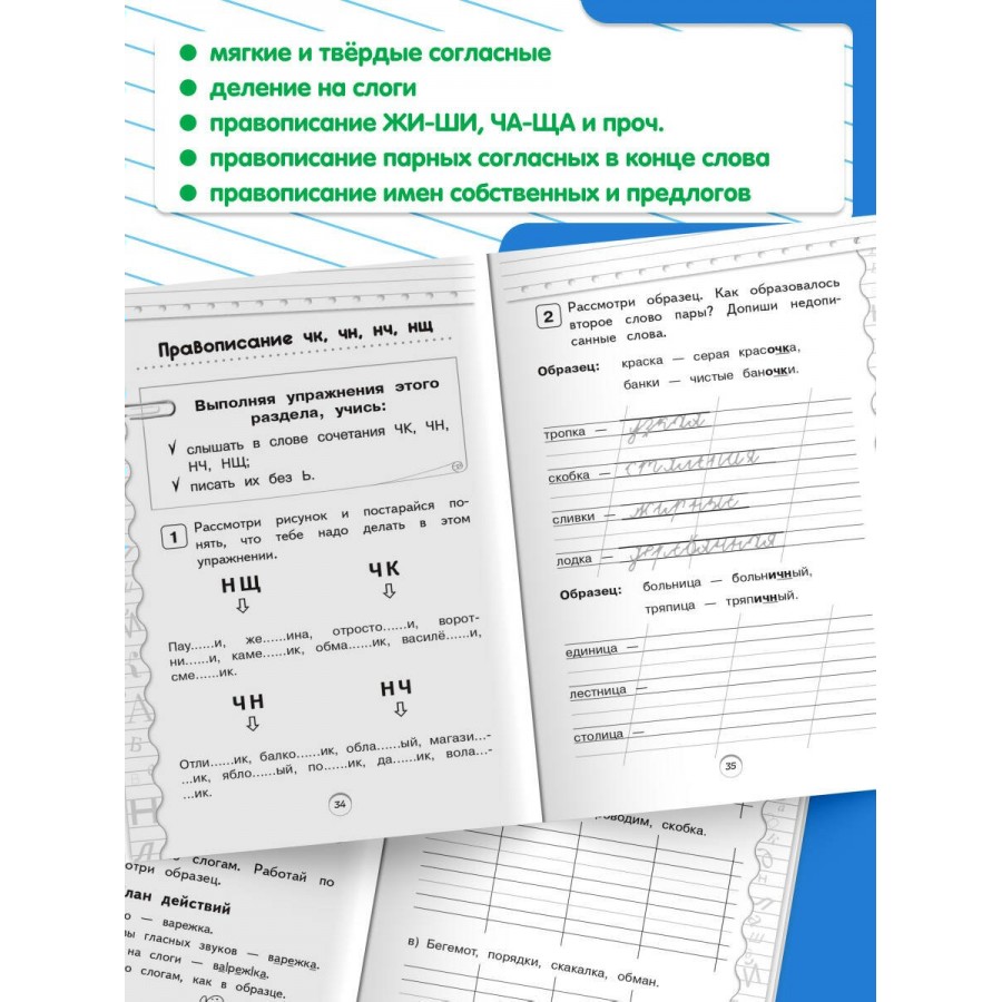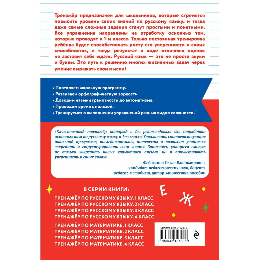 Пособие по русскому языку от издательства «Эксмо» подготовлено в соответствии с требованиями ФГОС для начальной школы и может быть использовано с любым из действующих учебников для 1 класса. Удобный тренажер с интересным современным макетом поможет ребёнку улучшить грамотность, восполнить пробелы, углубить и систематизировать знания. Занимаясь, школьник не только отработает основные темы школьной программы: правописание ЖИ-ШИ, ЧА-ЩА, ЧУ-ЩУ, ЧК, ЧН, НЧ, НЩ, парных согласных в конце слова, имен собственных, предлогов и др., но и научится работать по плану, то есть выполнять определенный алгоритм действий, который поможет ему осознанно применять правила. Когда навык грамотного письма будет доведен до автоматизма, результат в виде твердых знаний и отличных оценок не заставит себя ждать.