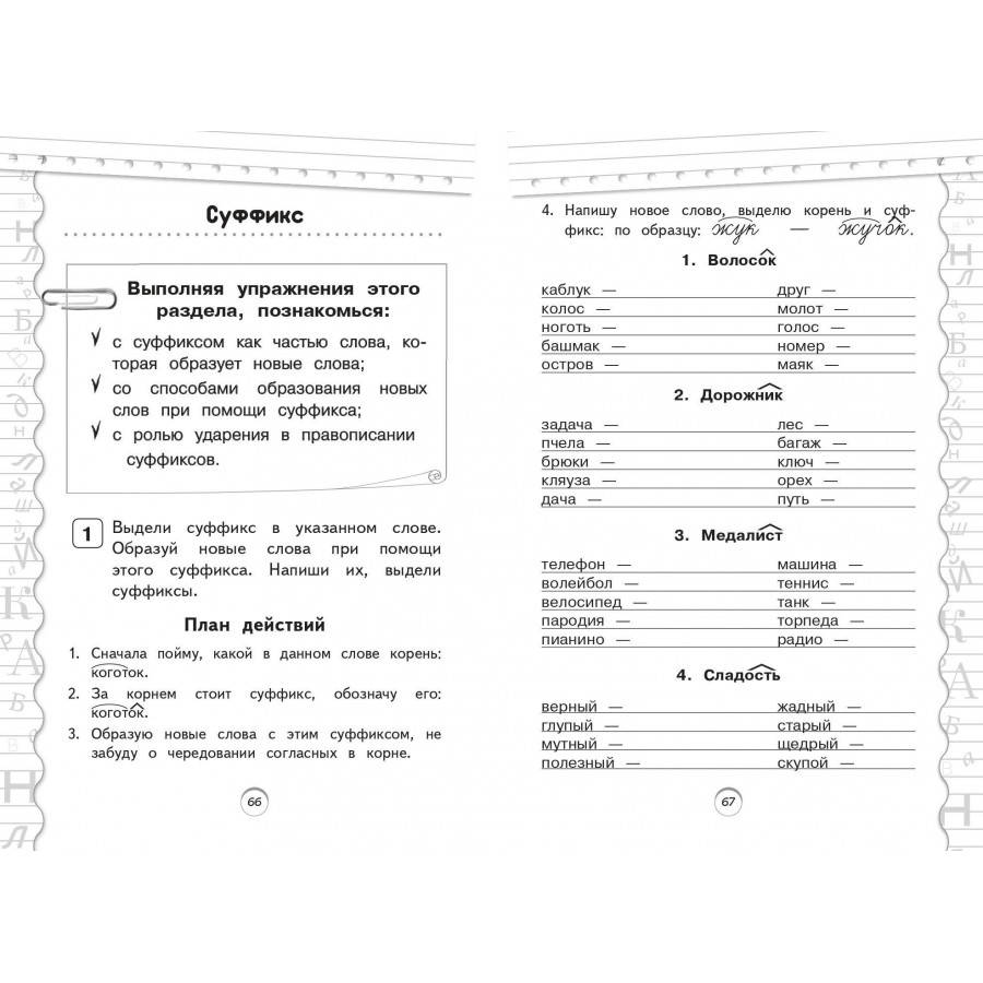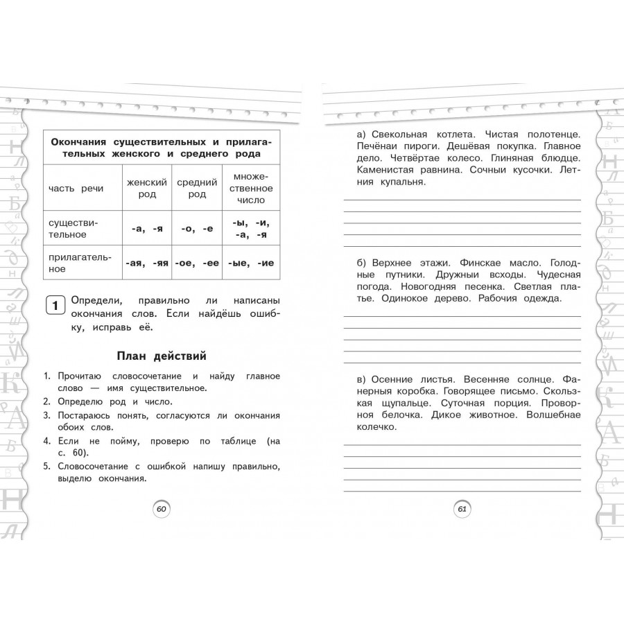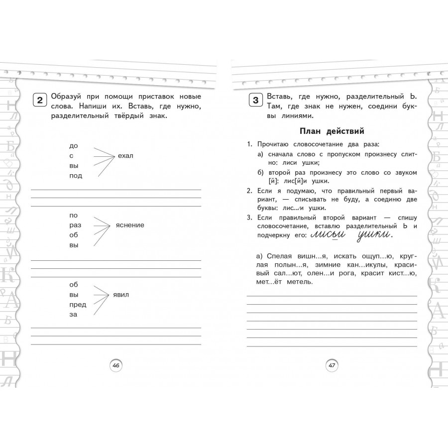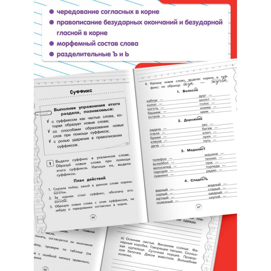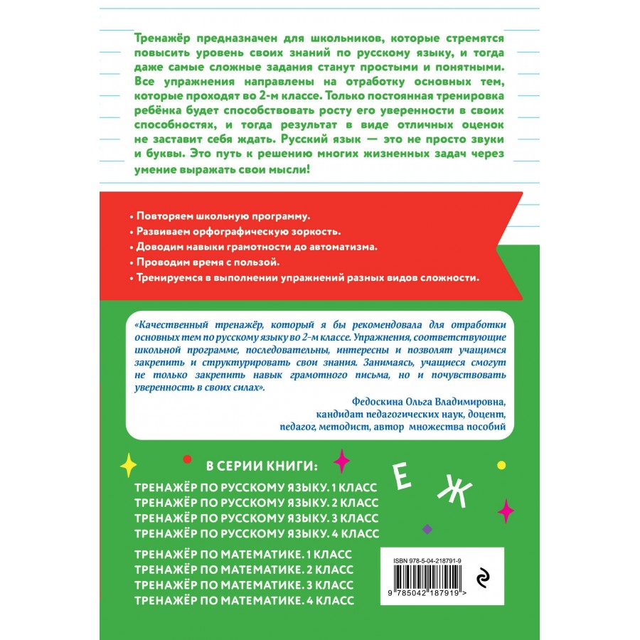 Пособие по русскому языку от издательства «Эксмо» подготовлено в соответствии с требованиями ФГОС для начальной школы и может быть использовано с любым из действующих учебников для 2 класса. Удобный тренажер с интересным современным макетом поможет ребенку улучшить грамотность, восполнить пробелы, углубить и систематизировать знания. Занимаясь, школьник не только повторит правописание безударной гласной в корне, безударных окончаний существительных и прилагательных женского и среднего рода, правила чередования согласных в корне, закрепит знания о разделительном Ъ и Ь, потренируется выделять приставку, корень и суффикс в слове, но и научится работать по плану, то есть выполнять определенный алгоритм действий, который поможет ему осознанно применять правила. Когда навык грамотного письма будет доведен до автоматизма, результат в виде твердых знаний и отличных оценок не заставит себя ждать.