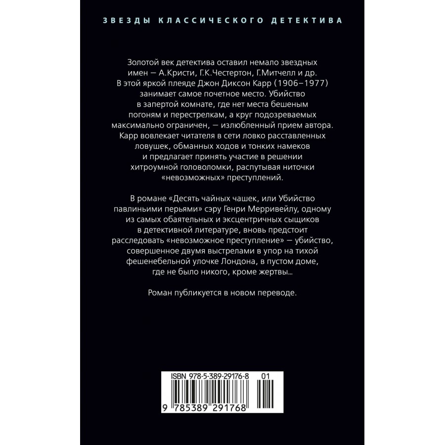 В романе «Десять чайных чашек, или Убийство павлиньими перьями» сэру Генри Мерривейлу, одному из самых обаятельных и эксцентричных сыщиков в детективной литературе, вновь предстоит расследовать «невозможное преступление» – убийство, совершенное двумя выстрелами в упор на тихой фешенебельной улочке Лондона, в пустом доме, где не было никого, кроме жертвы…