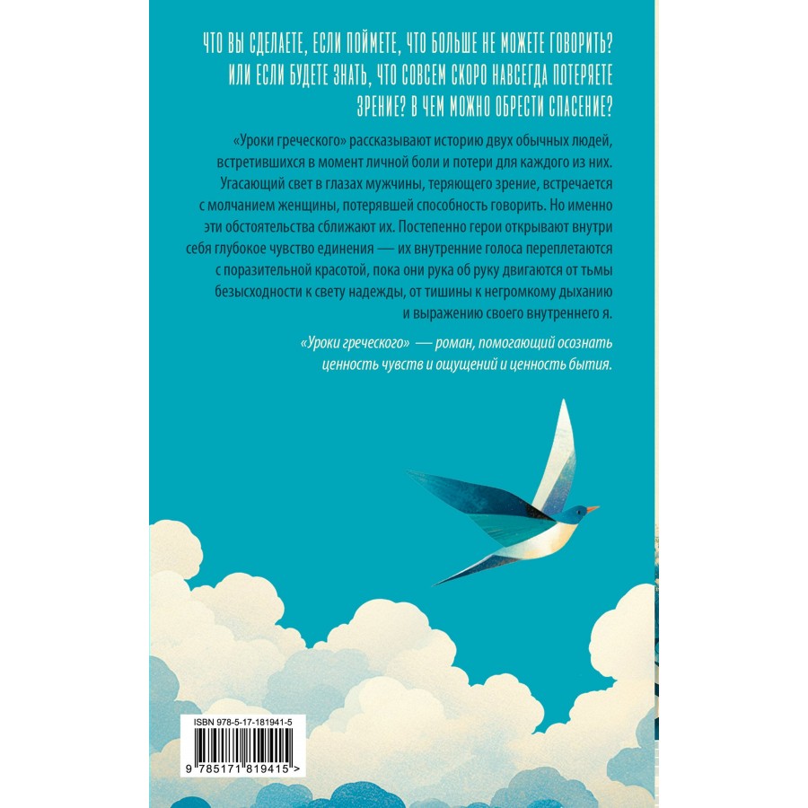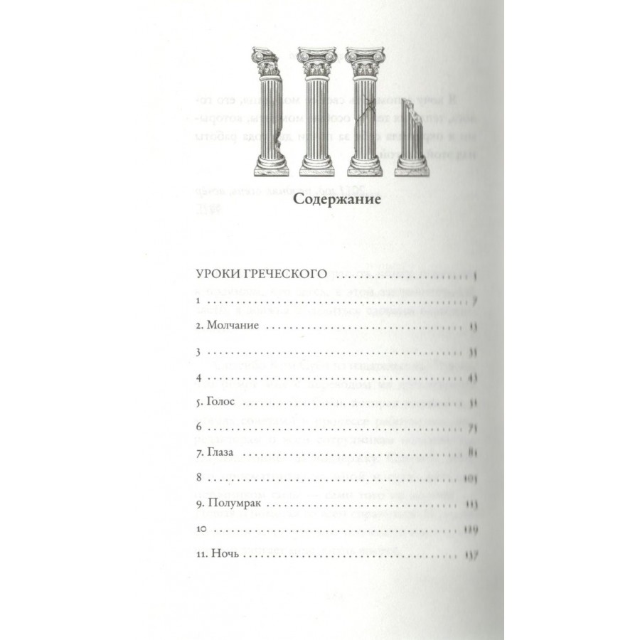 Уроки греческого" рассказывают историю двух обычных людей, встретившихся в момент личной боли и потери для каждого из них. Угасающий свет в глазах мужчины, теряющего зрение, встречается с молчанием женщины, потерявшей способность говорить. Но именно эти обстоятельства сближают их. Постепенно герои открывают внутри себя глубокое чувство единения — их внутренние голоса переплетаются с поразительной красотой, пока они рука об руку двигаются от тьмы безысходности к свету надежды, от тишины к негромкому дыханию и выражению своего внутреннего я. "Уроки греческого" — роман, помогающий осознать ценность чувств и ощущений и ценность бытия.