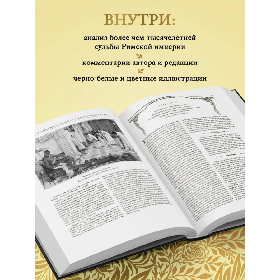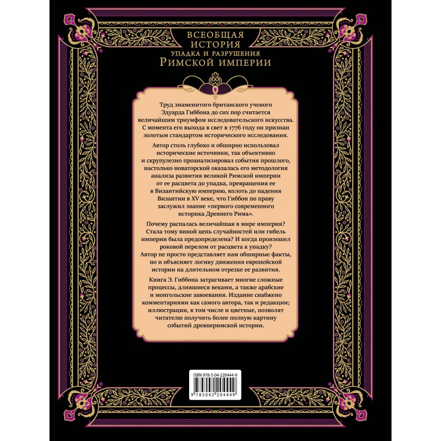 Фундаментальный труд Эдуарда Гиббона «История упадка и разрушения Римской империи» является одним из самых влиятельных и впечатляющих исторических произведений европейской литературы, прочно закрепившимся в общих представлениях об эпохе, которую по праву можно считать колыбелью европейской цивилизации. В фокусе исследования Гиббона — более чем тысячелетняя судьба римской цивилизации от «золотого века» империи при династии Антонинов до падения Константинополя под натиском осман в 1453 году.