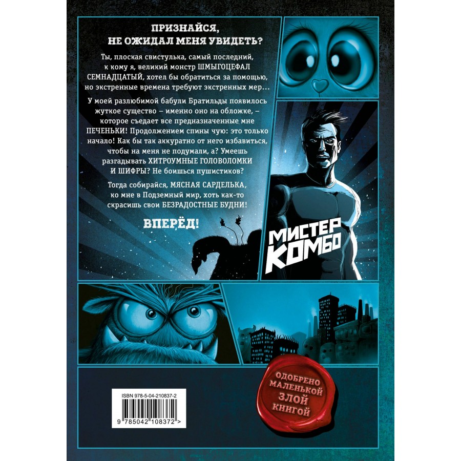 Четвёртая книга популярного цикла «Выпусти меня отсюда!». Книга-квест: переходы на разные страницы, стильные иллюстрации и юмор. Интересно даже тем детям, кто не любит читать! ПРИЗНАЙСЯ, НЕ ОЖИДАЛ МЕНЯ ВИДЕТЬ? Шпинат в сливочном соусе и отрыжка! Ты, плоская свистулька, самый последний, к кому я, великий монстр ШМЫГОЦЕФАЛ СЕМНАДЦАТЫЙ, хотел бы обратиться за помощью, но экстренные времена требуют экстренных мер… У моей разлюбимой бабули Братильды появилось жуткое существо - именно оно на обложке, - которое съедает все предназначаемые мне ПЕЧЕНЬКИ! Продолжением спины чую: это только начало! Как бы так аккуратно от него избавиться, чтобы на меня не подумали, а? Умеешь разгадывать ХИТРОУМНЫЕ ГОЛОВОЛОМКИ И ШИФРЫ? Не боишься пушистиков? Тогда собирайся, МЯСНАЯ САРДЕЛЬКА, ко мне в Подземный мир, хоть как-то скрасишь свои БЕЗРАДОСТНЫЕ БУДНИ!