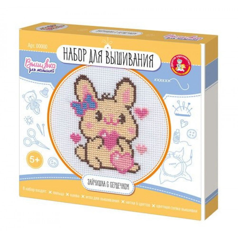 С Набором для вышивки «Зайчишка с сердечком» вы подарите незабываемые минуты творчества любителям рукоделия. А симпатичный персонаж порадует ребенка и украсит интерьер детской комнаты.