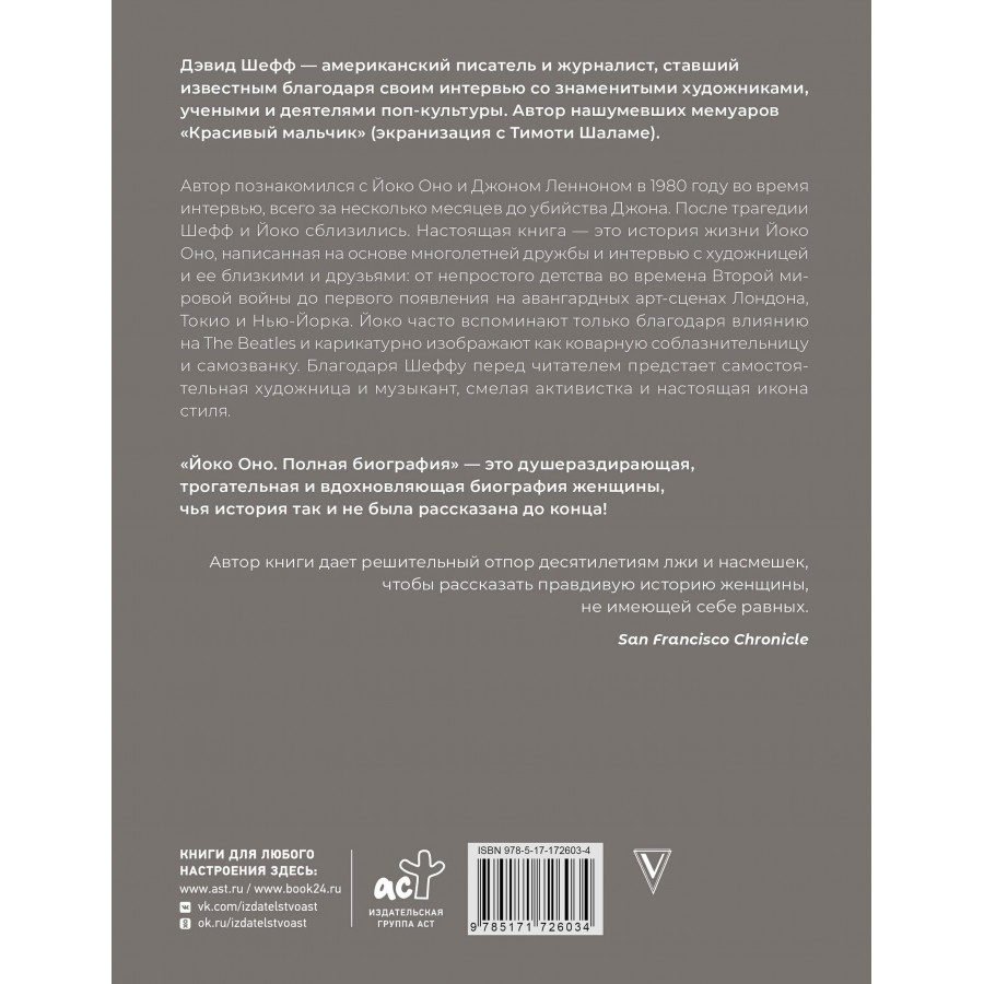 Автор познакомился с Йоко Оно и Джоном Ленноном в 1980 году во время интервью, всего за несколько месяцев до убийства Джона. После трагедии Шефф и Йоко сблизились. Настоящая книга — это история жизни Йоко Оно, написанная на основе многолетней дружбы и интервью с художницей и ее близкими и друзьями: от непростого детства во времена Второй мировой войны до первого появления на авангардных арт-сценах Лондона, Токио и Нью-Йорка. Йоко часто вспоминают только благодаря влиянию на The Beatles и карикатурно изображают как коварную соблазнительницу и самозванку. Благодаря Шеффу перед читателем предстает самостоятельная художница и музыкант, смелая активистка и настоящая икона стиля.