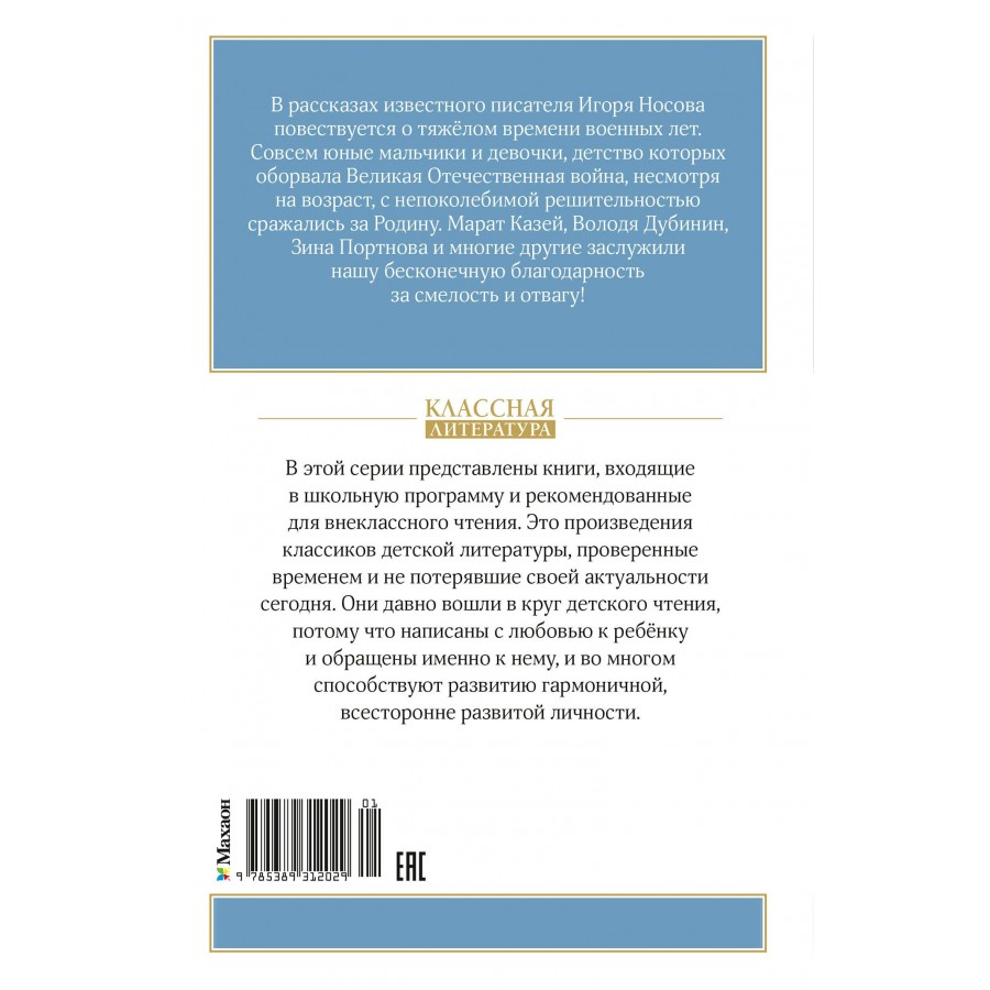 В рассказах известного писателя Игоря Носова повествуется о тяжёлом времени военных лет. Совсем юные мальчики и девочки, детство которых оборвала Великая Отечественная война, несмотря на возраст, с непоколебимой решительностью сражались за Родину. Марат Казей, Володя Дубинин, Зина Портнова и многие другие заслужили нашу бесконечную благодарность за смелость и отвагу!