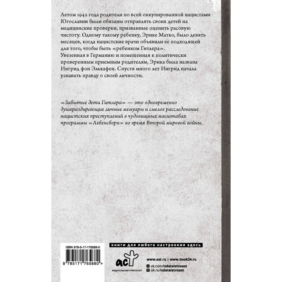 "Забытые дети Гитлера" — это одновременно душераздирающие личные мемуары и смелое расследование нацистских преступлений в чудовищных масштабах программы "Лебенсборн" во время Второй мировой войны.