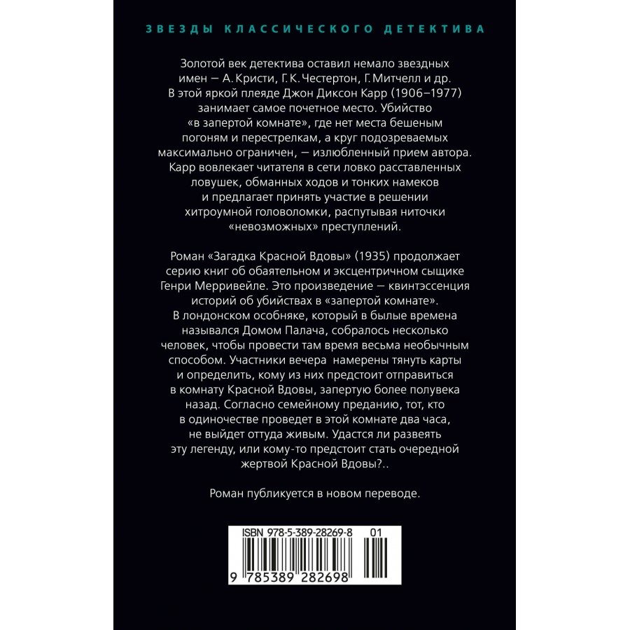 Золотой век детектива оставил немало звездных имен — А. Кристи, Г. К. Честертон, Г. Митчелл и др. В этой яркой плеяде Джон Диксон Карр (1906–1977) занимает самое почетное место. Убийство "в запертой комнате", где нет места бешеным погоням и перестрелкам, а круг подозреваемых максимально ограничен, — излюбленный прием автора. Карр вовлекает читателя в сети ловко расставленных ловушек, обманных ходов и тонких намеков и предлагает принять участие в решении хитроумной головоломки, распутывая ниточки "невозможных" преступлений. Роман "Загадка Красной Вдовы" (1935) продолжает серию книг об обаятельном и эксцентричном сыщике Генри Мерривейле. Это произведение — квинтэссенция историй об убийствах в "запертой комнате". В лондонском особняке, который в былые времена назывался Домом Палача, собралось несколько человек, чтобы провести там время весьма необычным способом. Участники вечера намерены тянуть карты и определить, кому из них предстоит отправиться в комнату Красной Вдовы, запертую более полувека назад. Согласно семейному преданию, тот, кто в одиночестве проведет в этой комнате два часа, не выйдет оттуда живым. Удастся ли развеять эту легенду, или кому-то предстоит стать очередной жертвой Красной Вдовы?..