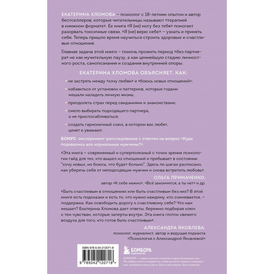 «Быть счастливым в отношениях или быть счастливым без них? В этой книге есть ответы и есть вопросы. Есть подсказки, и есть то, что нужно каждому, кто сомневается, — поддержка. Как освободить дорогу к счастливому себе? Что нам мешает? Екатерина Хломова дает ответы, бережно подбирая ключ к тем чувствам, которые заперты внутри. Эта книга глоток свежего воздуха для того, кто готов быть счастливым». — Александра Яковлева, психолог, журналист, автор и ведущая подкаста «Психология с Александрой Яковлевой»