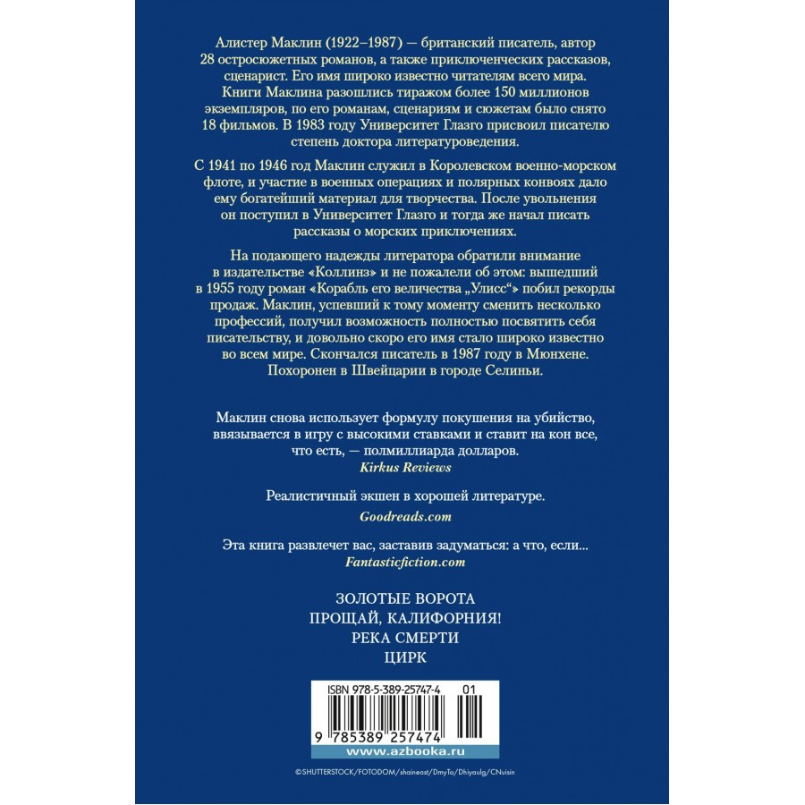 Алистер Маклин (1922–1987) — британский писатель, автор 28 остросюжетных романов и приключенческих рассказов, сценарист. Его имя широко известно читателям всего мира. Книги Маклина разошлись тиражом более 150 миллионов экземпляров, по его романам, сценариям и сюжетам было снято 18 фильмов. В 1983 году Университет Глазго присвоил писателю степень доктора литературоведения.